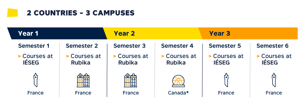 管理与技术设计专业本科课程的第四学期在蒙特利尔进行,期间存在一些严格的条件限制:它会根据加拿大相关法规的变化而有所调整,需要获得学习许可或访问签证(但无法保证一定能获批),并且需要有足够多的学生获得必要的许可才能继续进行。若这些条件无法满足,IÉSEG 和 Rubika 将致力于寻找替代方案。